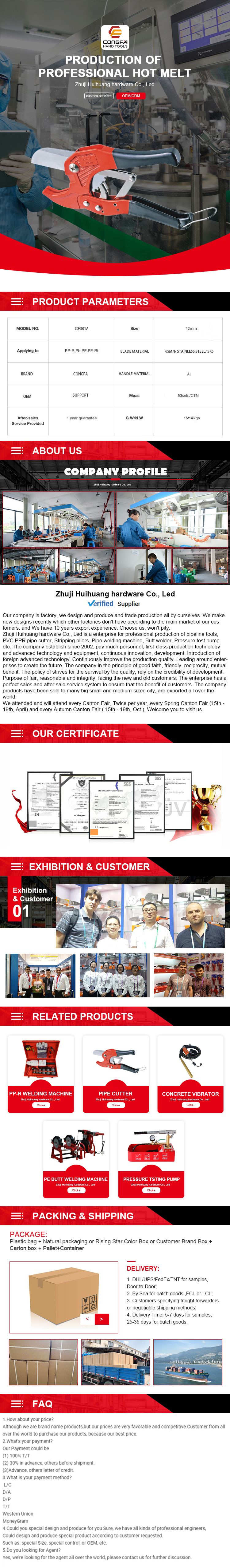 诸暨市辉煌五金有限公司是一家专业生产管道工具,PVC,PPR剪管器、电动修枝剪、热熔器、对焊机、试压泵等的企业。