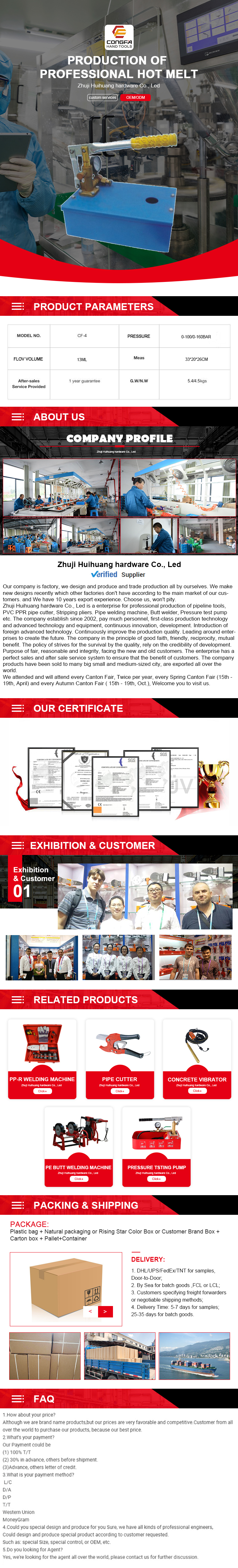 诸暨市辉煌五金有限公司是一家专业生产管道工具,PVC,PPR剪管器、电动修枝剪、热熔器、对焊机、试压泵等的企业。