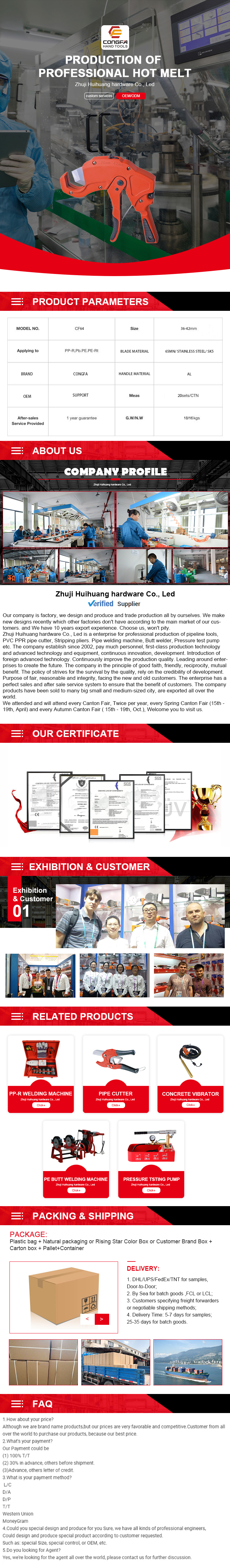 诸暨市辉煌五金有限公司是一家专业生产管道工具,PVC,PPR剪管器、电动修枝剪、热熔器、对焊机、试压泵等的企业。