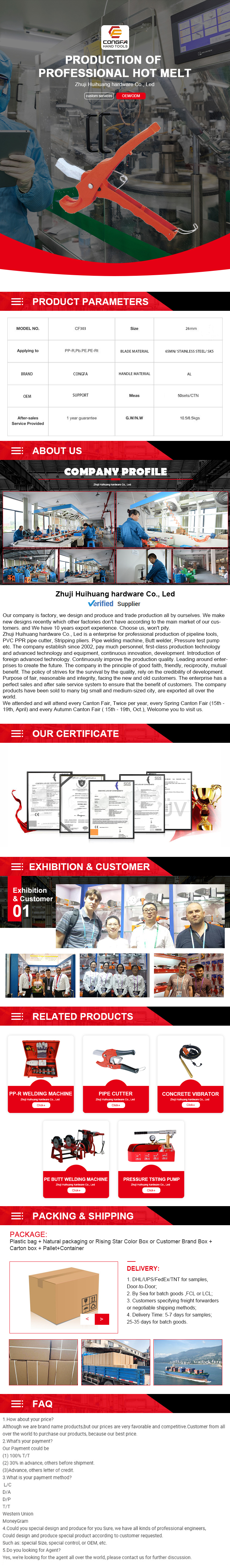 诸暨市辉煌五金有限公司是一家专业生产管道工具,PVC,PPR剪管器、电动修枝剪、热熔器、对焊机、试压泵等的企业。